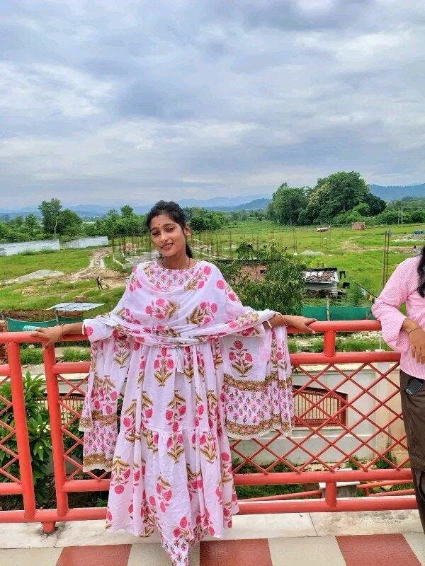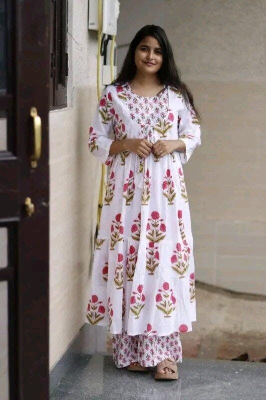 Step into timeless elegance with this White & Pink Floral Anarkali Palazzo Set. Crafted from pure cotton fabric with a flowy mulmul dupatta, this set is designed for comfort and festive charm. The pink floral prints add a refreshing touch, while tassels and latkans enhance the overall look.