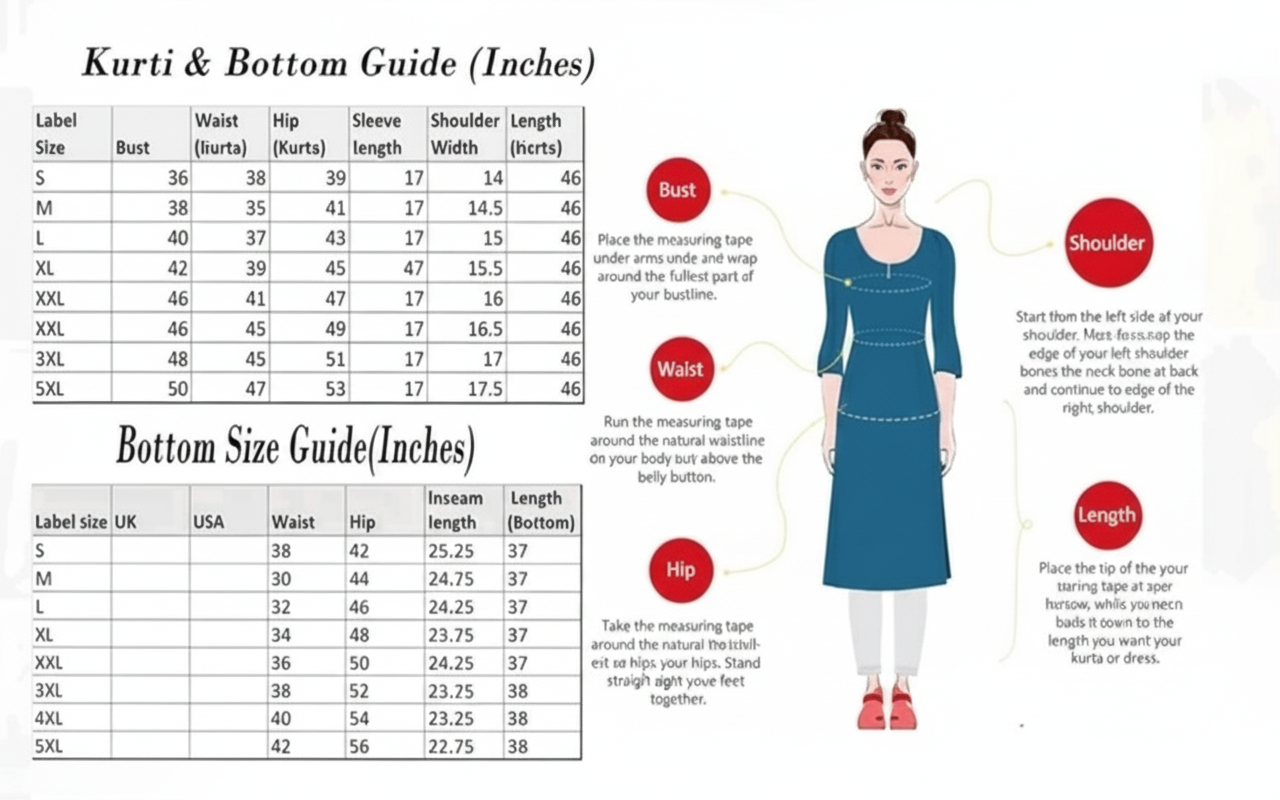 XXXL: Bust 46 in | Kurta Length 45 in | Waist 38 in | Bottom Length 38 in | Dupatta 2 m | Shoulder 15 in